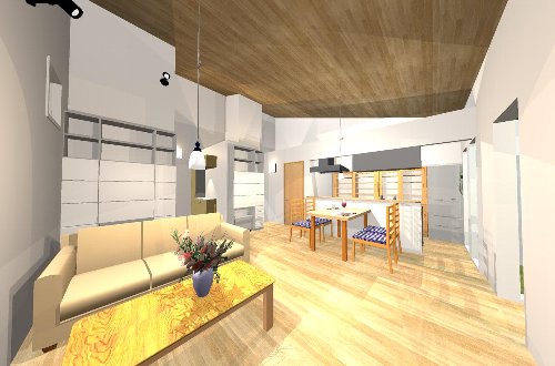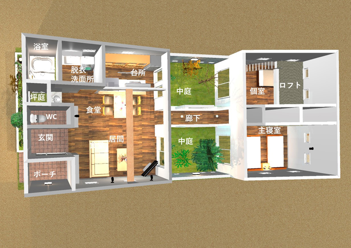 | 以上、シェルターハウスの設計例を紹介させていただきました。 この案は一つの基本案ですので、建て主のご要望で様々なプラン、デザインが可能です。 事務所としての設計力をご理解いただければ幸いです。 |