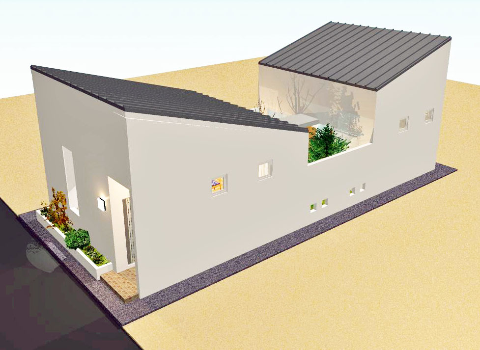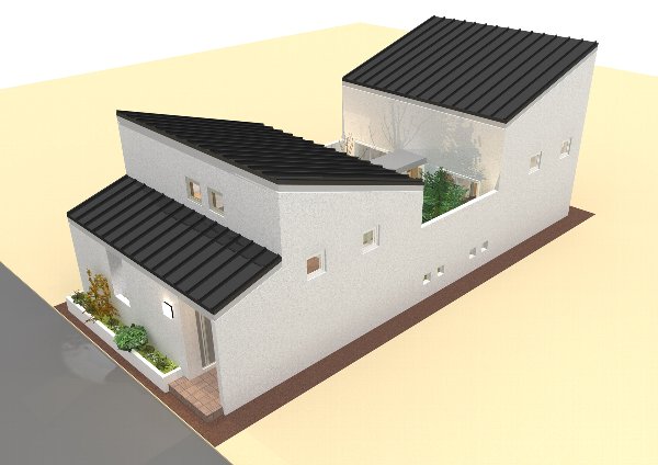 ■外観 屋根の形状は各種のデザインが可能ですが、この案は中庭への採光を重視した片流れとしています。 外回りの開口部(窓)は、プライバシー重視で最小限としています。 |