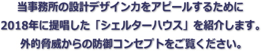 | 住宅は、そこで暮らす家族と財産を地震、火災、犯罪などあらゆる外的脅威から守り、安全を確保することが求められます。 これを突き詰めるとシェルターになります。 しかし、外的脅威からは守りたいが、その一方であまりに閉鎖的であることを好まず、開放性があり近隣との良好なコミュニケーションも保つことを重要との考えもあります。 この二つのなかなか両立することは難しく最終的には建て主の判断によります。 今回は、このシェルター的要素を優先した住宅の設計例を紹介します。 |