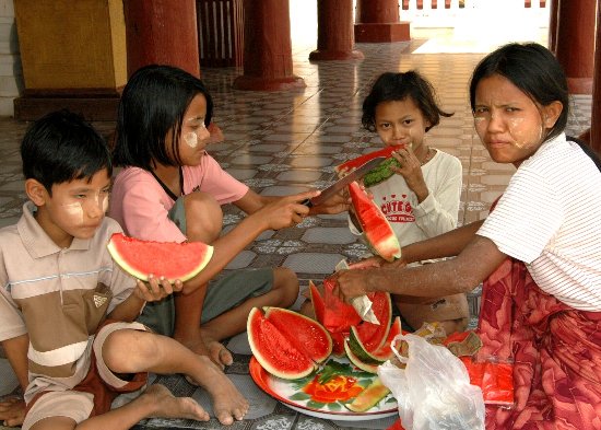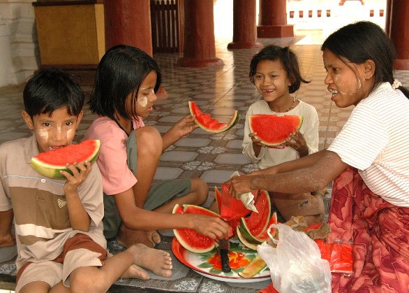 ![]() ▲境内のスイカ売りの娘達は、残り物なのか時々売り物を食べてしまう。 |