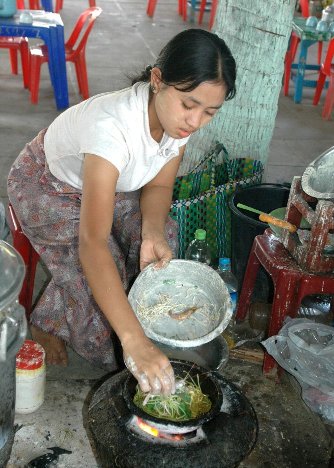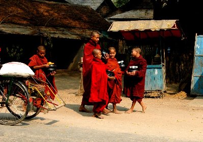 ![]() ▲パゴダの中の仏様へのお供え物は、気持ちをこめて大事に運ぶ |