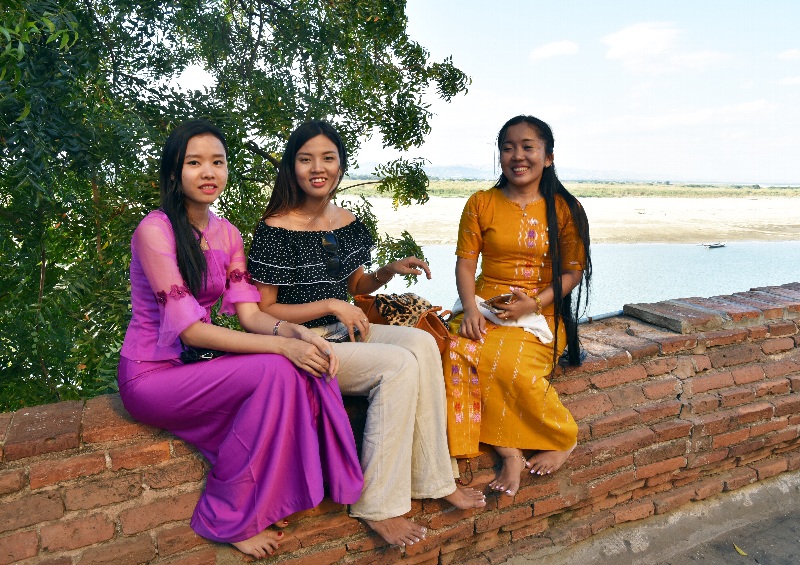 ![]() ▲境内で楽しそうに女子トーク中。中央の女性は珍しくロンジー姿ではない(ローカナンダパゴダ Lawka Nandar Pagoda にて) |